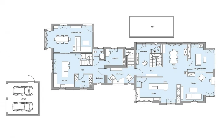 Sanft weht der Herbstwind über die grünen Wiesen und trägt die letzten bunten Blätter fort. In der Ferne hört man die Wildgänse, die auf ihrem Weg nach Süden einen Zwischenstopp am nahen See eingelegt haben. Inmitten dieser idyllischen Umgebung hat sich Familie Fröhlich ihren Traum vom Haus erfüllt: Eine zeitlos schöne Landhausvilla mit Erker, romantischen Sprossenfenstern – zum Garten hin bodentief ausgeführt – und dunklen Klappläden. Was man auf den ersten Blick nicht ahnt, wenn man sich von der Straße nähert: Bei dem eleganten Neubau handelt es sich eigentlich um zwei eigenständige Häuser, die über einen eingeschossigen Zwischenbau miteinander verbunden sind. Im hinteren Haus leben die Bauherren selbst, das vordere Haus hat eines der Kinder samt Familie bezogen. Dank der cleveren Planung wird nicht nur das Grundstück optimal ausgenutzt, sondern auch die Privatsphäre der beiden Parteien gewahrt. Jede Familie hat ihre eigenen Rückzugsbereiche. Wenn man aber Nähe sucht, etwa für einen Besuch der Enkelin bei der Oma oder auf ein gemeinsames Abendessen, findet man schnell zueinander. Der Haupteingang befindet sich im Zwischenbau: Eine nostalgische Kassettentüre mit Fensterelementen geleitet Besucher und Bewohner stilvoll in den gemeinsamen Windfang, von dem die beiden Wohneinheiten abgehen.Grundrisse und Hausmaße