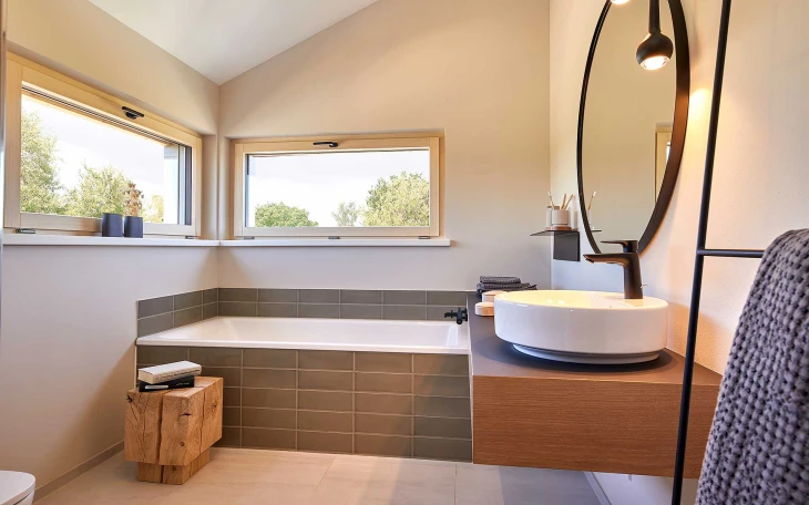 Das Haus Lichtblick von Baufritz ist ein Designerhaus im modernen Stil mit einer Fläche von 127,45 m² auf 2 Etagen. Die Wohnfläche teilt sich auf 5 Zimmer auf, davon 3 Schlafzimmer.Dieses Einfamilienhaus mit Satteldach wird in der Bauweise Bio-Holzhaus errichtet und erfüllt den Energiestandard Effizienzhaus 55.