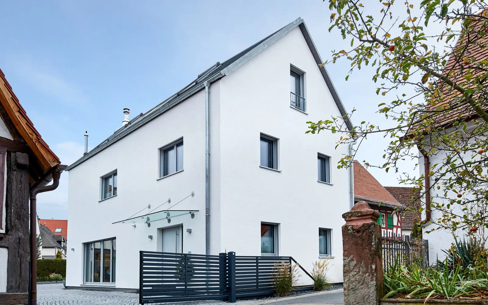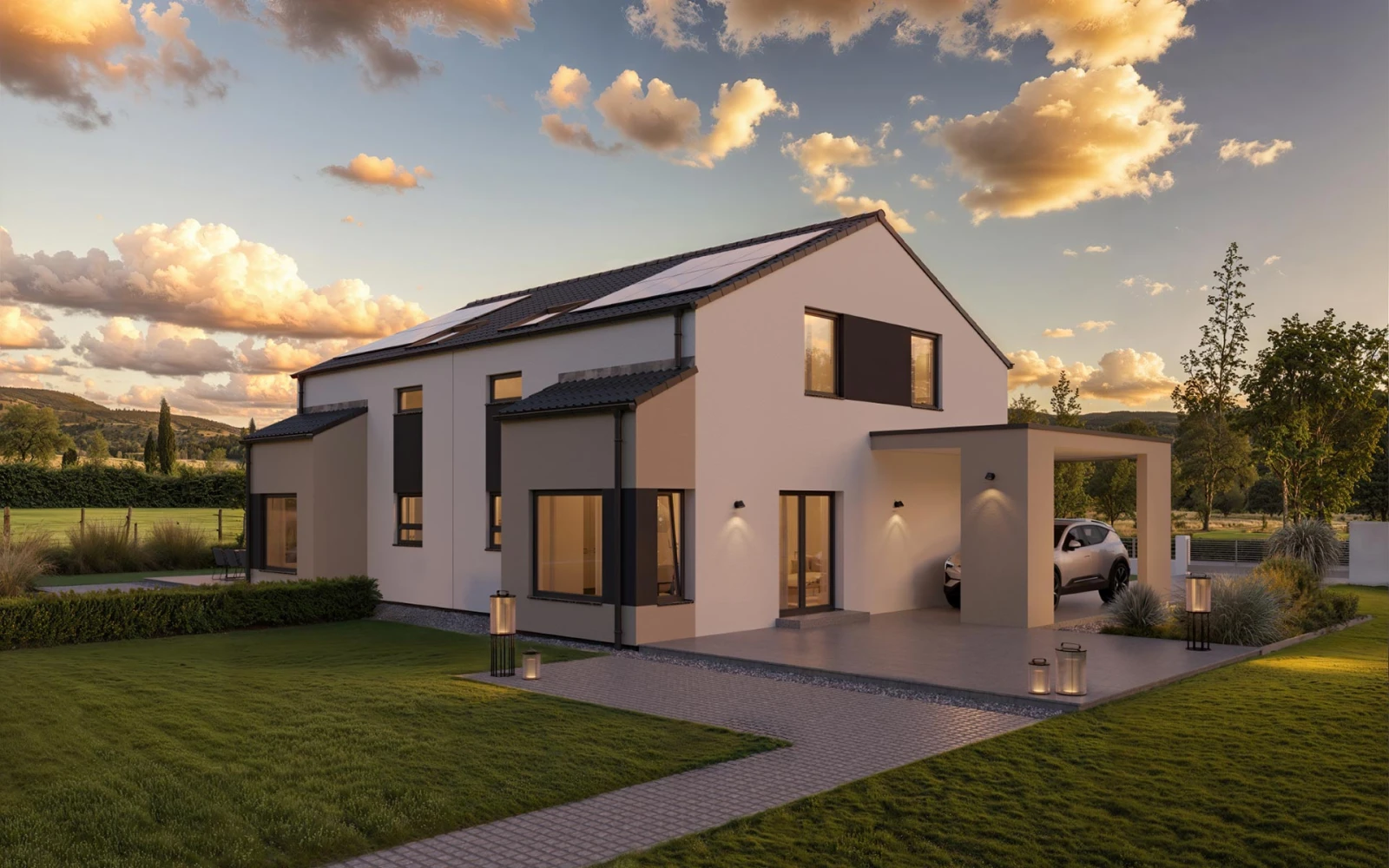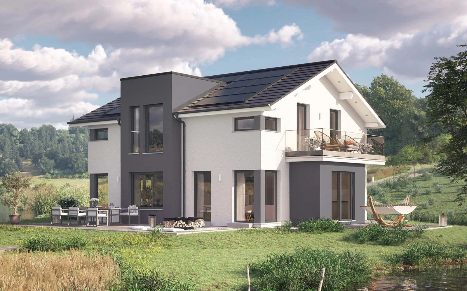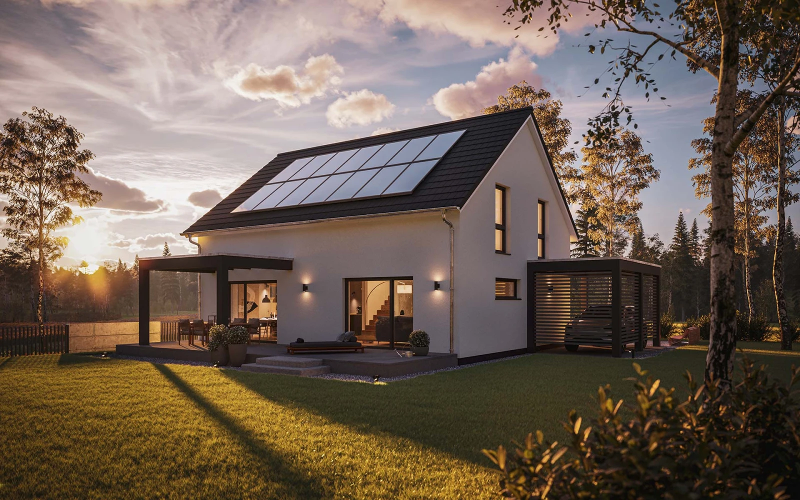 Moderne Fertighäuser mit Satteldächern sind clever konstruiert und sorgen mit hochwertigen Materialien für eine ausgezeichnete Wärmedämmung, die die im Gebäudeenergiegesetz (GEG) vorgeschriebenen Grenzwerte meist sogar weit unterschreitet. So können Sie die verschiedensten Energiestandards erreichen und mit einer hervorragenden Ökobilanz punkten. Giebeldächer sind aufgrund ihrer geneigten Dachflächen außerdem besonders gut für die Installation einer Fotovoltaikanlage geeignet. Die Solarthermie ist eine weitere attraktive Möglichkeit und reduziert die Kosten für fossile Brennstoffe zum Heizen und zur Warmwasseraufbereitung deutlich. Um solche Anlagen wirtschaftlich und effizient betreiben zu können, ist eine Südausrichtung und eine Dachneigung zwischen 30 und 35 Grad optimal und wird von Experten empfohlen. Eine Ost-West-Ausrichtung ist auch machbar und beeinträchtigt die Erträge nur geringfügig, insofern es keine Verschattung durch Bäume oder umliegende Gebäude gibt.Infobox