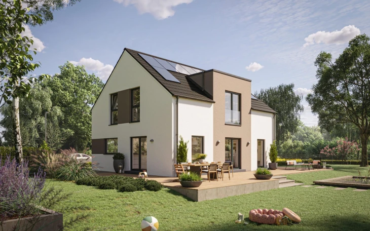 Das Haus Meins-E-155 von Danhaus ist ein Familienhaus im klassischen Stil mit einer Fläche von 154,37 m² auf 1,5 Etagen. Die Wohnfläche teilt sich auf 5 Zimmer auf, davon 3 Schlafzimmer.Dieses Einfamilienhaus mit Satteldach wird in der Bauweise Fertighaus errichtet und erfüllt den Energiestandard Effizienzhaus 40-KFN+QNG.