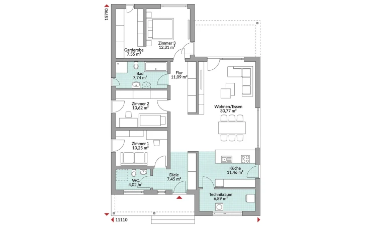 inklusive Maler, Fliesen, Sanitär, Vinyl, Teppichboden und Technikpaket (Luft-Wasser-Wärmepumpe + Fußbodenheizung + zentrale Lüftungsanlage mit Wärmerückgewinnung) ab Oberkante BodenplatteGrundrisse und Hausmaße