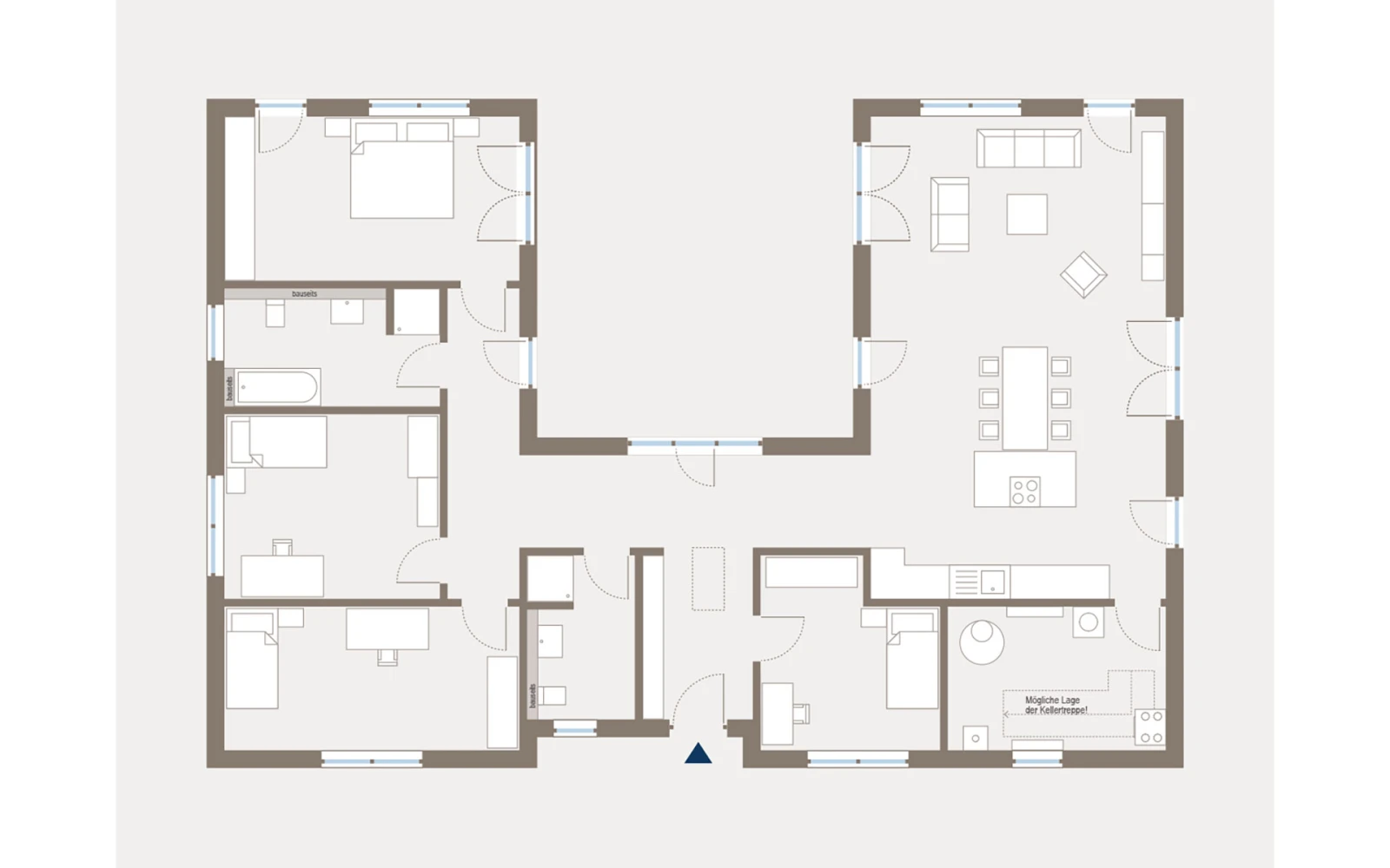 Der Grundriss eines Bungalows ist in den meisten Fällen offen gestaltet, hängt letztendlich aber von der Form und Größe des Baus ab. Apropos: Welche Hausgröße passt überhaupt aufs Grundstück? Zur Beantwortung dieser Frage hilft ein Blick in den Bebauungsplan. Denn dort ist für jedes Flurstück festgelegt, welchen Abstand das Gebäude von den Nachbargrundstücken haben muss und wie es mit der maximalen Bebauungsfläche aussieht. Bauherren sind also gut beraten, die geltende Regelung vor dem Grundstückskauf abzuklopfen.Da beim Bungalow ohne Keller der Treppenbau entfällt, steht im Erdgeschoss mehr Platz für die Wohnräume zur Verfügung. Große Fensterfronten sorgen für viel Tageslicht und eine unverbaute Sicht auf den Terrassen- und Gartenbereich. Sie verleihen dem Leben auf einer Ebene damit das Plus an Freiheitsgefühl und lassen die Wohnfläche noch geräumiger erscheinen. Alternativ ist natürlich auch das Konzept abgetrennter Wohnbereiche möglich. Dies bringt mehr Privatsphäre und Rückzugsorte mit sich, bietet dafür aber weniger Bewegungsspielraum und Weite.