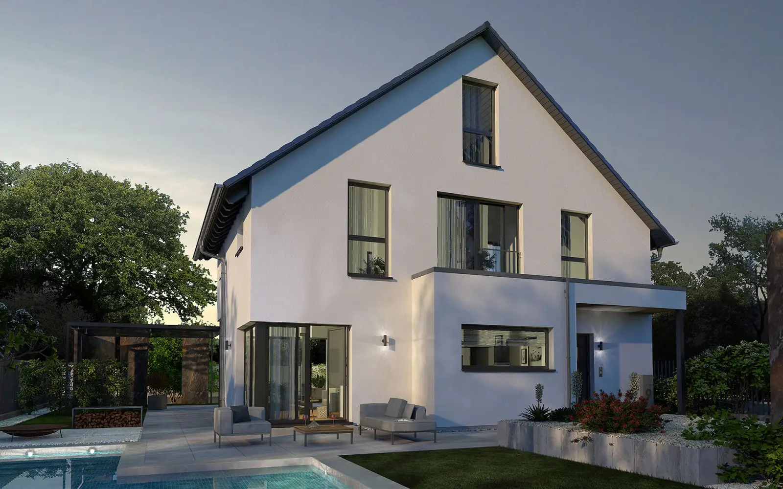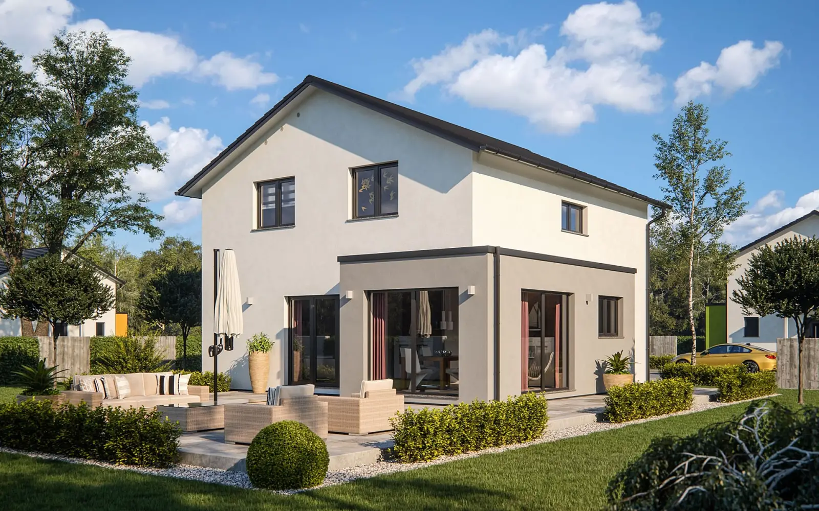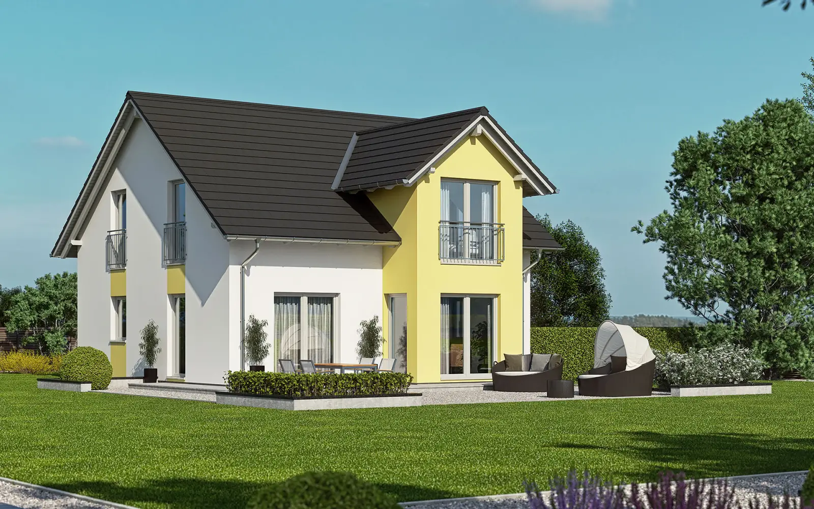 Kubushäuser sind moderne, meist quadratische Bauten – schlicht und gradlinig. Sie unterliegen dem Einfluss des Bauhausstils und ihr Markenzeichen ist ein Flachdach, das ihnen ihr würfelförmiges Aussehen verleiht. Die Nutzung der Flachdachfläche für eine zusätzliche Terrasse oder zum Aufbau einer Fotovoltaikanlage bietet sich an.Der Satteldach-Klassiker als Familienhaus