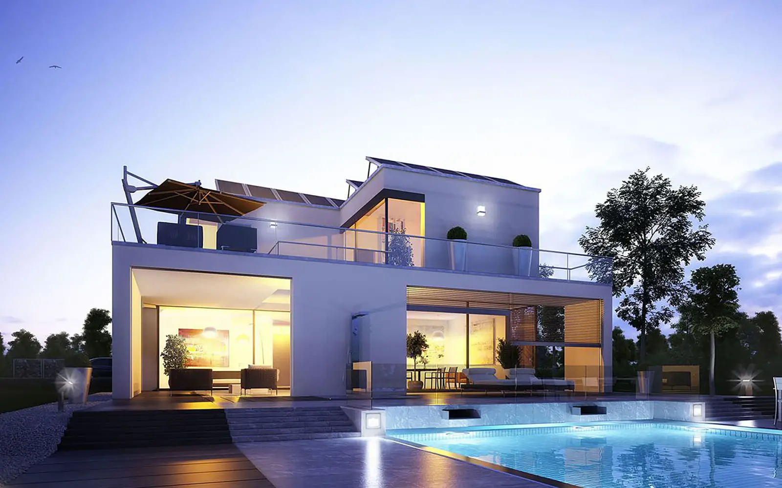 Beim klassischen Kubushaus ist das Flachdach zur Erhaltung der klaren Linienführung beinahe ein Muss, auch wenn diese Dachvariante in der Regel wartungsintensiver und witterungsanfälliger ist als ein klassisches Satteldach. Wer das freie Areal in der luftigen Höhe eines Flachdachs nicht ungenutzt lassen möchte, kann es beispielsweise zur Dachterrasse ausbauen – für ungestörte Sonnenstunden oder eine exklusive Rooftop-Party. Auch der Aufbau einer Anlage für Solarthermie oder Fotovoltaik ist auf Flachdächern sehr beliebt, spart in Zeiten steigender Energiekosten bares Geld und schont gleichzeitig die Umwelt.Alles Wissenswerte über Flachdächer