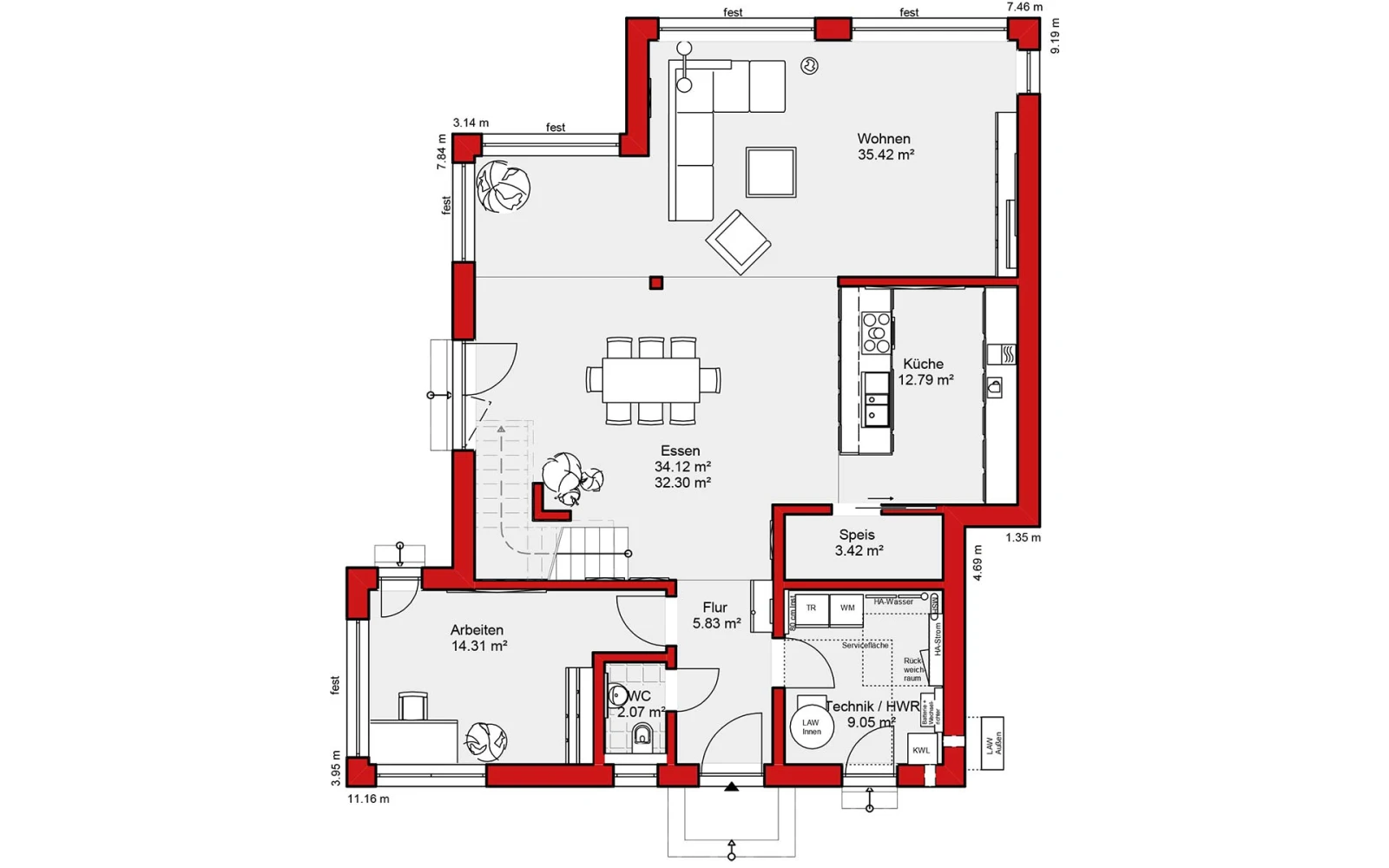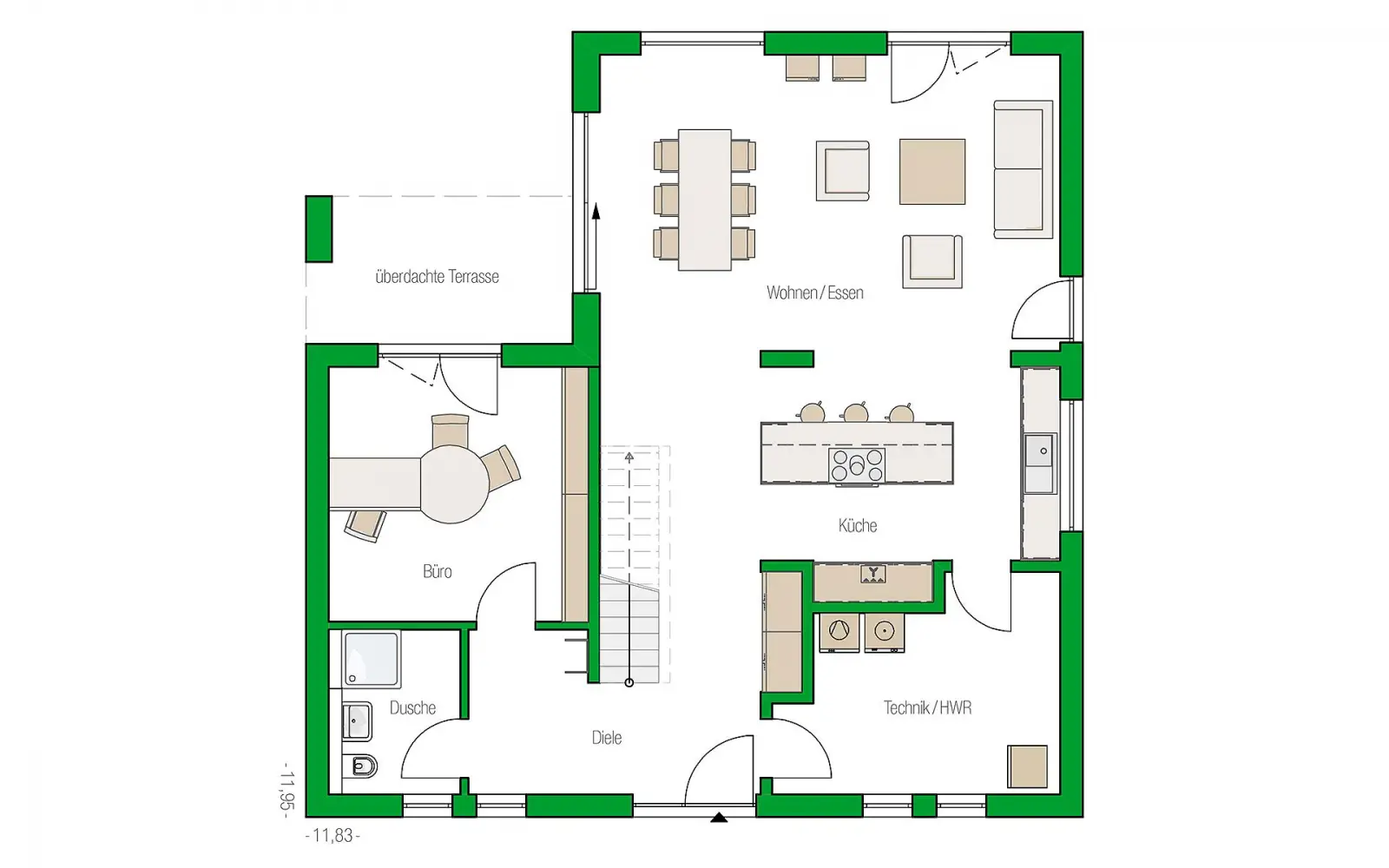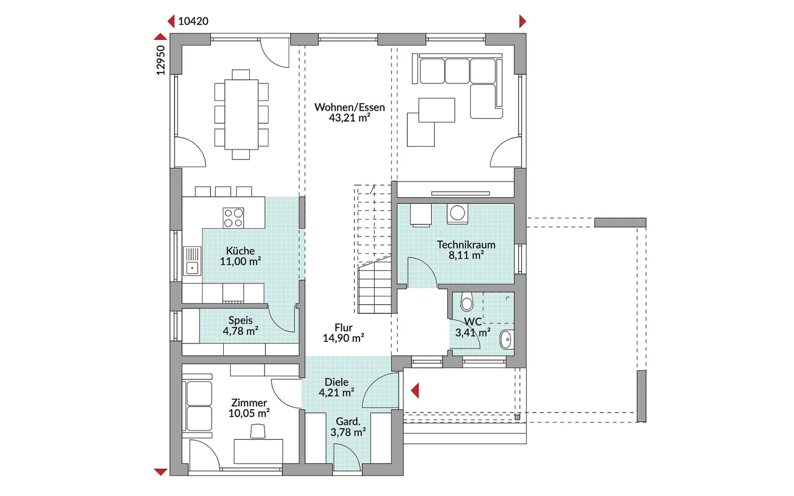 Steht eine bestimmte Quadratmeterzahl im Raum, fällt es vielen Häuslebauern schwer, sich anhand dieser Information die tatsächlichen Verhältnisse der Wohraumgröße vorzustellen. Im Folgenden finden Sie daher einige Grundriss-Beispiele der einzelnen Geschosse ausgewählter Stadtvillen, die Sie jedoch gemeinsam mit dem jeweiligen Haushersteller abwandeln, anpassen oder ganz neu planen können. Für viele Wünsche haben die Anbieter bereits Musterlösungen parat, die clever geplant und preiswert sind. Zur noch besseren Visualisierung schauen Sie sich auch gerne die ausdrucksstarken Bilder zu den Außenansichten und Inneneinrichtungen der Stadtvillen auf unseren Musterhaus-Detailseiten an.
