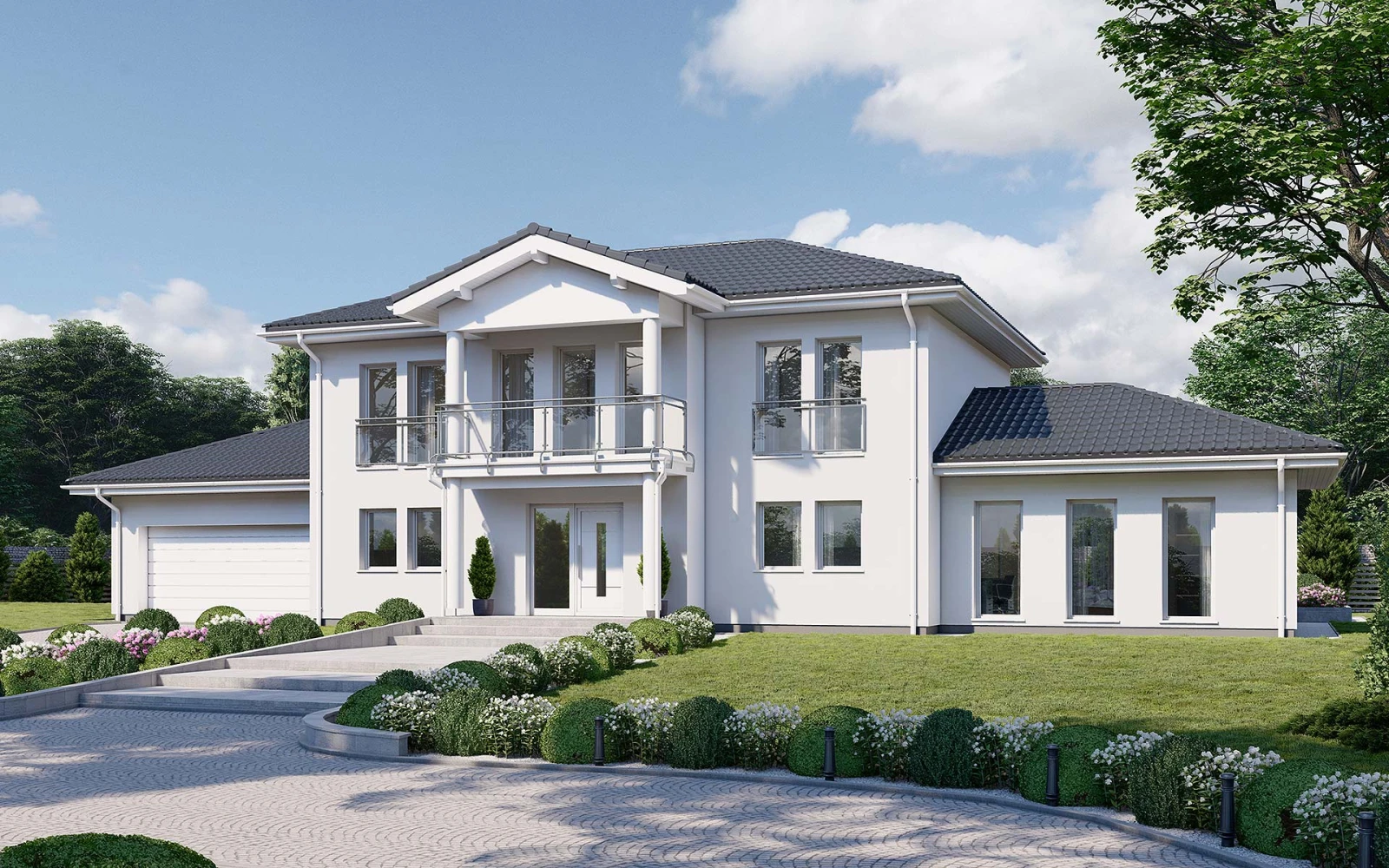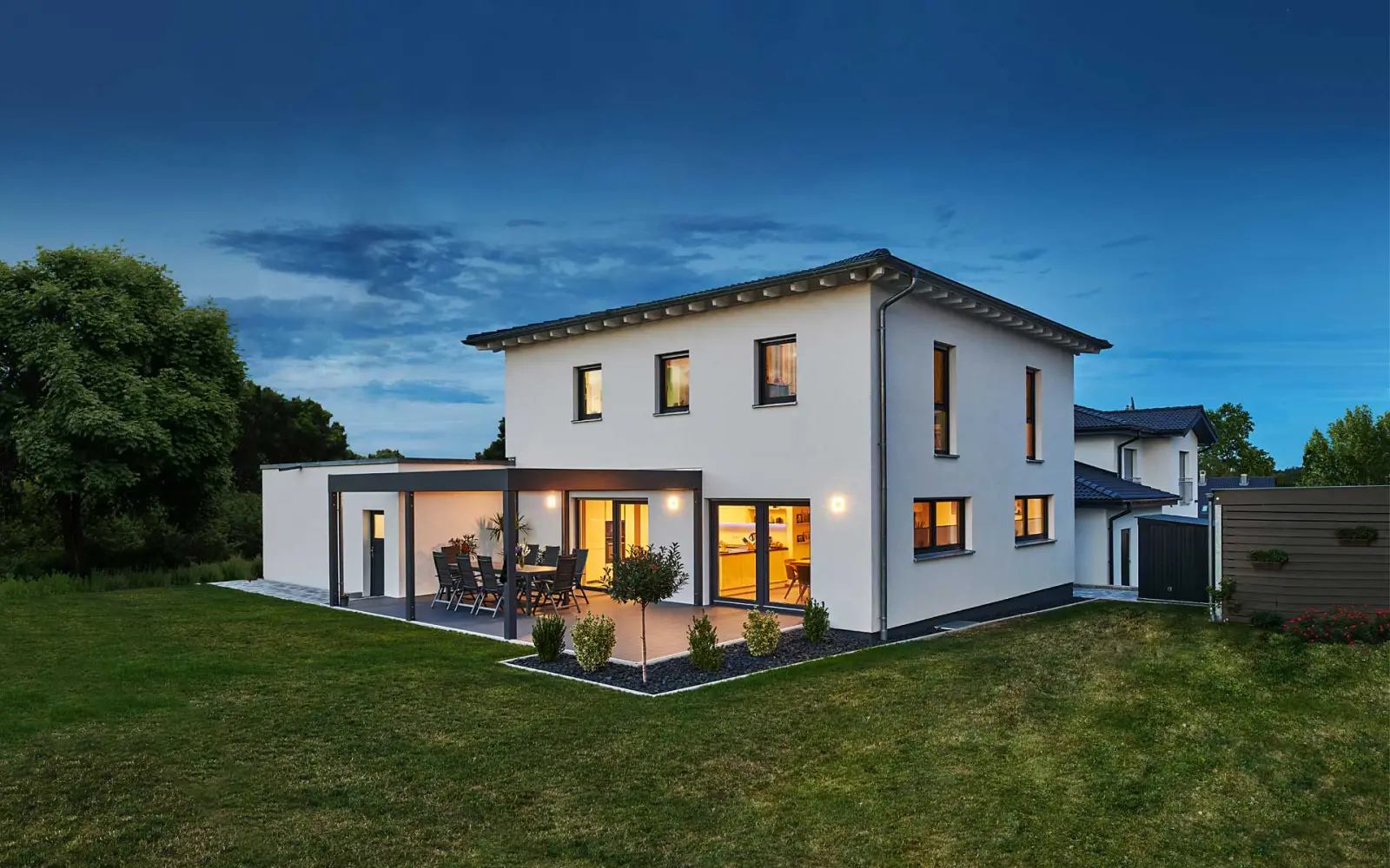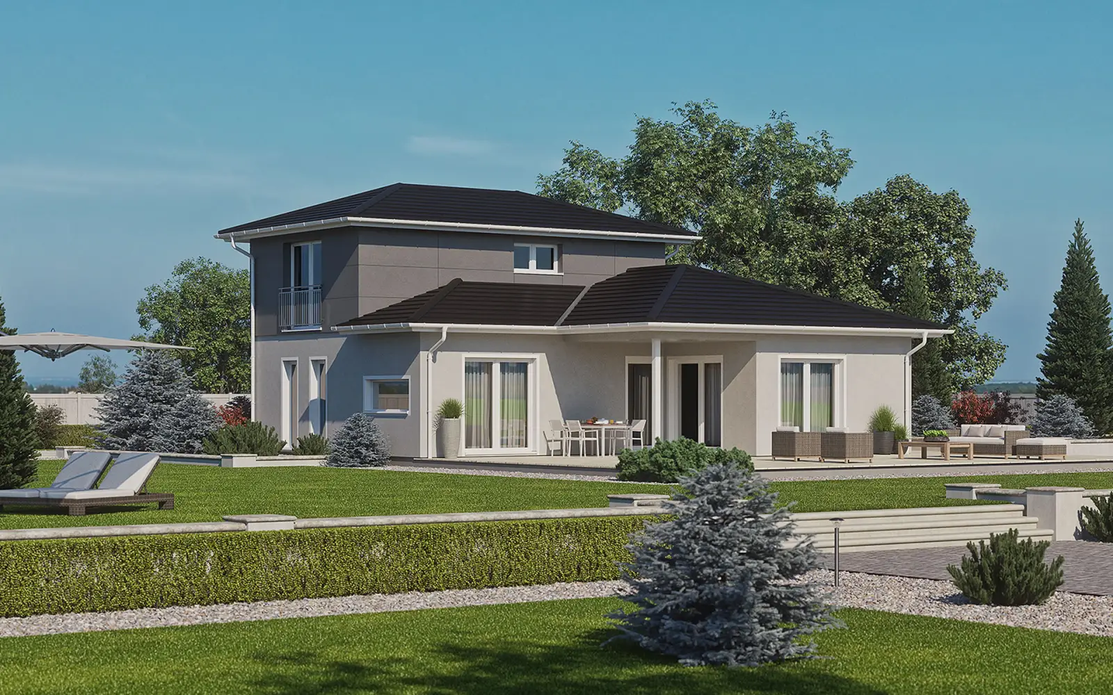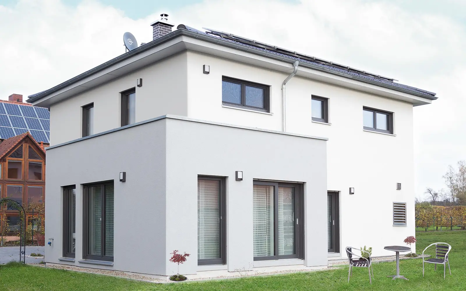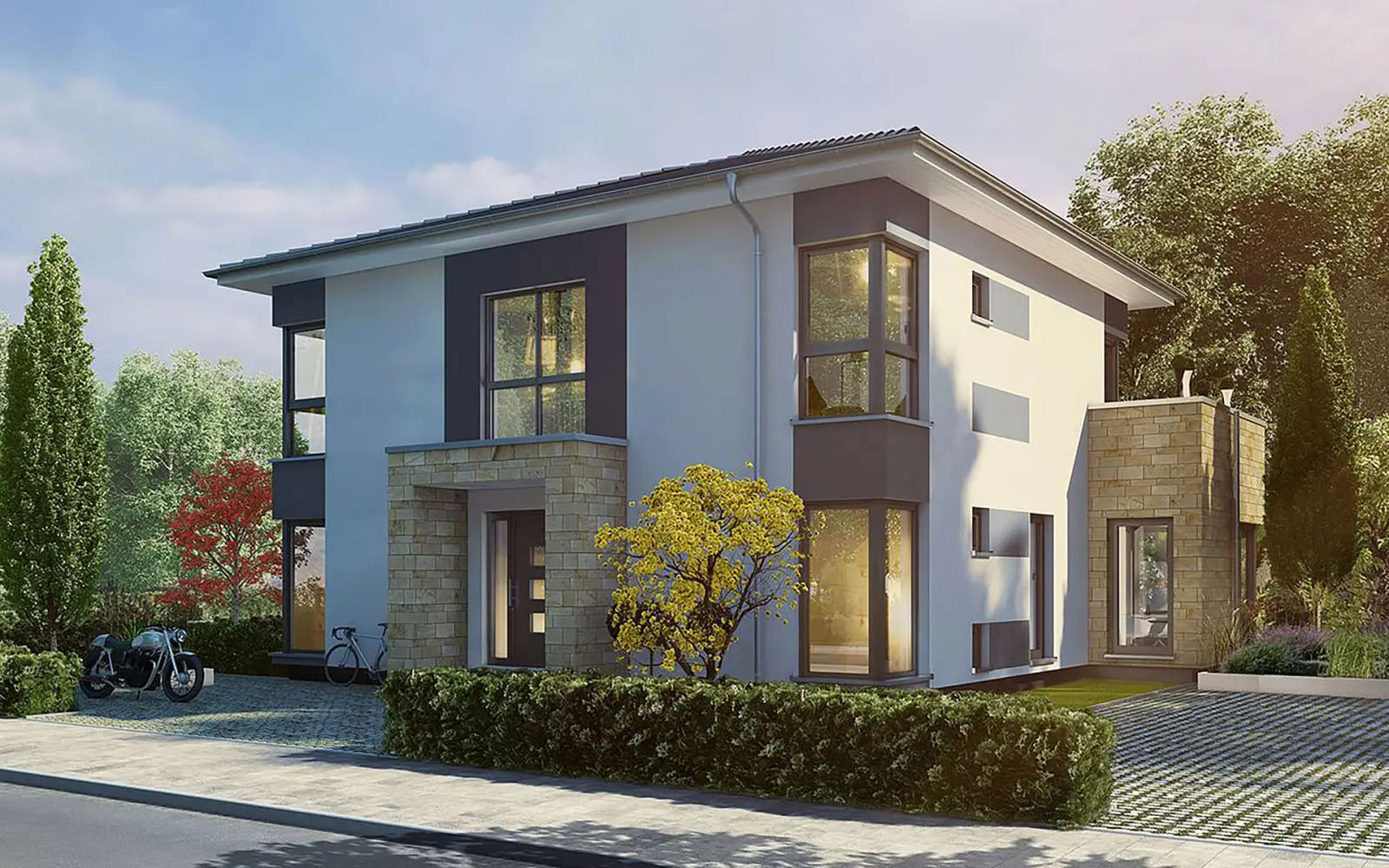 Stadtvillen bestehen oft aus einem kubischen Baukörper mit klarer Linienführung und einem leicht geneigten Dach. Sie weisen in der Regel zwei Vollgeschosse auf und finden auf etwas kleineren Grundstücken ebenso Platz wie auf großen, wodurch sie sich optimal für die Stadt- und Stadtrandlage eignen – daher auch der Name Stadtvilla. Die Art des Daches wie auch die Fassadengestaltung richten sich bei der Planung ganz nach dem persönlichen Gusto der zukünftigen Eigenheimbesitzer. Der klassische Grundriss sieht offene Wohnwelten mit großen Räumen vor, die ein hohes Maß an Bewegungsfreiheit bieten. Eine individuelle Anpassung ist dabei problemlos möglich. Breite Fensterfronten sorgen darüber hinaus für viel Tageslicht und schaffen einen angenehmen Wohnkomfort.Die Stadtvilla ist durch ihr einerseits imposantes und andererseits doch schlichtes Auftreten in Deutschland ein beliebter Haustyp. Er kommt auch in dicht bebauten Ortsteilen immer öfter vor und bietet eine willkommene Abwechslung im Bild der Satteldachsiedlungen. Die heutigen Stadtvillen haben mit den adeligen Villen vergangener Zeiten dabei nur noch wenig gemeinsam. Konnten sich diese exquisiten Bauten früher nur sehr betuchte Bürgerinnen und Bürger leisten, sind die repräsentativen Gebäude durch ihre einfache Konstruktion in der Grundausstattung inzwischen auch für viele Normalverdiener durchaus finanzierbar.