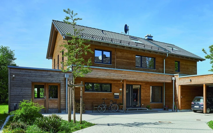 Gut zu erkennen: Haus, Carport und Abstellraum präsentieren sich mit einer einheitlichen Konstruktion. Diese besteht im Außenbereich aus Lärche-Massivholzbohlen, gehobelt und mit doppelter Nut und Feder, in der Länge keilgezinkt. Für Kenner ist hier bereits klar: Es handelt sich um eine „Twinligna“-Bauweise des niederbayerischen Holzhausspezialisten Sonnleitner Holzbauwerke aus Ortenburg in der Nähe von Passau. Hauptmerkmal dieser mehrschichtigen Konstruktion: Durchgehend ökologisch, holzfasergedämmt, diffusionsoffen, basierend auf einem doppelwandigen Blockbohlenkern. Eine ungewöhnliche Bauweise, für die der Hersteller zu Recht überregional bekannt wurde.