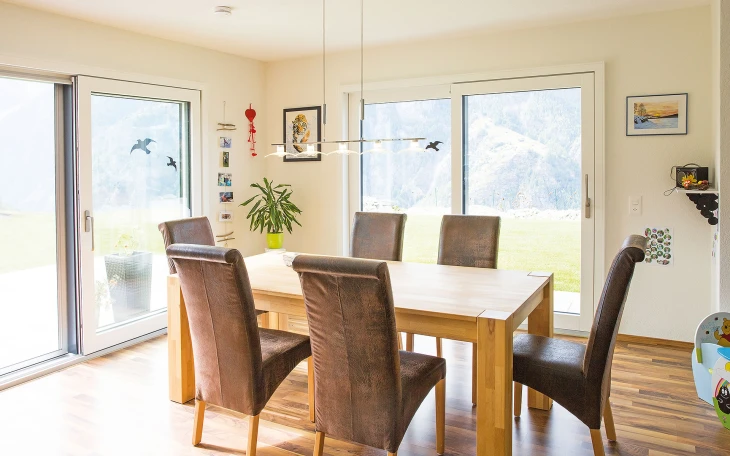 Ein Traumhaus in einer Traumgegend hat unsere Schweizer Baufamilie in den Walliser Bergen verwirklicht. Mit dem Materialmix an der Fassade von Putz und Holz sowie einem dritten Giebel erhält das Haus in Anlehnung an die Baureihe „Balance“ eine individuelle Note. Einen schönen Kontrast zum Holz bildet die eher kühle Farbwahl der Dachziegel.