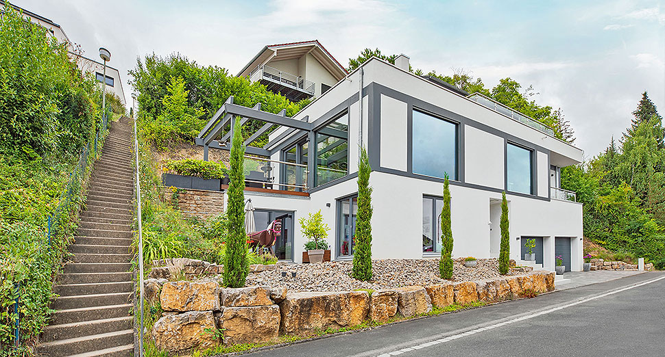 Eine Möglichkeit für eine kosteneffiziente Hausplanung, die dem gewünschten Komfort eines Eigenheims dennoch ganz und gar gerecht wird, kann zum Beispiel der Verzicht auf ein Obergeschoss sein – gerade in Hanglage. „Bei einem Baugrundstück am Hang ist der Keller in der Regel der einzig sinnvolle Unterbau und kann ergänzt um ein Erdgeschoss mehr als genug Wohnfläche für die ganze Familie bieten. Talseitig empfehlen sich große Räume und Fensterflächen, sodass stockwerksübergreifend reichlich Tageslicht ins Haus strömen kann“, sagt Stephan Braun. Gerade an kalten, aber sonnigen Tagen lassen große Fenster nicht nur den Wohnkomfort, sondern auch die Wärmegewinne merklich ansteigen, während die Heizkosten sinken. Auf Wunsch helfen moderne Sonnenschutzsysteme dabei, die im Sommer als angenehm empfundenen Temperaturen im Keller zu wahren. „Ein Untergeschoss am Hang ist dann auch ein idealer Platz für die Schlafzimmer“, schließt Braun.